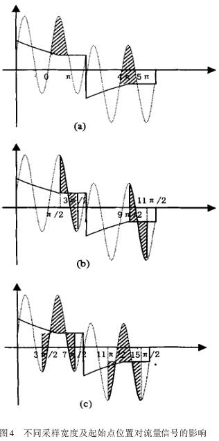 圖4(a)~ (c)直觀地描述了不同采樣寬度及采樣起始點(diǎn)位置對流量信號的影響 。設(shè)為信號采樣起始相位角,令為相位差 ;為采樣寬度誤差 都很小 ,可視為無窮小 。圖4(a)的采樣寬度為誤差為