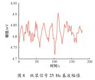 在頻域中對(duì)紙漿信號(hào)觀察時(shí)發(fā)現(xiàn),紙漿信號(hào)的漿液噪聲頻帶在零頻率點(diǎn)附近,距離流量信號(hào)基波頻率點(diǎn)較遠(yuǎn),對(duì)基波幅值和各奇次諧波幅值基本沒有影響,紙漿信號(hào)在頻域中的圖形如圖7所示。選擇一組采集的紙漿信號(hào),把其等分成數(shù)段,利用MATLAB計(jì)算每段數(shù)據(jù)在基波處的幅值并提取保存在一個(gè)數(shù)組中,使用繪圖工具畫出來(lái),如圖8所示。可見,基波幅值在4.7~4.95mV變化,波動(dòng)較小。因此,提取到的與流量相關(guān)的感應(yīng)電動(dòng)勢(shì)信號(hào)幅值會(huì)比較穩(wěn)定。