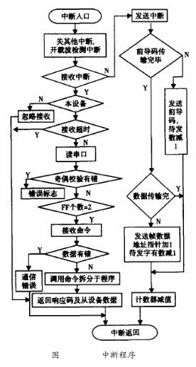 在HART通信中,地下污水流量計作為從設(shè)備進行通訊,所以這里的軟件設(shè)計只是針對于從設(shè)備。HART通信采用水平和垂直校驗的方法。當(dāng)檢測到接收數(shù)據(jù)有差錯時,則等到主設(shè)備命令幀發(fā)完后,通知主設(shè)備數(shù)據(jù)接收有誤。主設(shè)備則重新發(fā)命令幀,從而保證通信的準確可靠。HART中斷子程序流程圖如圖6所示。由于HART通信為主從方式,HART幀中每個字節(jié)在物理層傳輸需要9ms左右,為了保證通訊的實時性,通訊程序采用串行口終端接收/發(fā)送。該中斷所要完成通信中的主要任務(wù),即接收和發(fā)送幀,幀的拆分和打包。