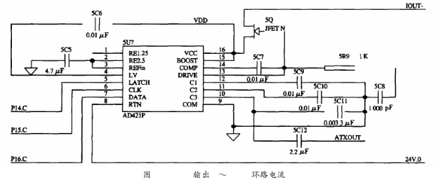 HT2012需要外部提供460.8kHz的時鐘信號,且要求時鐘頻率的誤差是0.1%,若直接入一個460.8kHz的晶振不僅會引起系統(tǒng)功耗的增加,而且該晶振屬于非標(biāo)準(zhǔn)晶振,需專門定制。為了解決這一問題,在系統(tǒng)中采用一片1.8432MHz的晶振以產(chǎn)生時鐘信號,再經(jīng)分頻器CD4013進(jìn)行4分頗,可輸出1.8432MHz/4=460.8kHz的分頻信號供HT2012使用。AD421其內(nèi)部的電壓調(diào)節(jié)器與外部的場效應(yīng)管DN25D對輸入到AD421的電壓進(jìn)行調(diào)整,可提供+3.3V電壓作為其他設(shè)備的電源。HART發(fā)出的FSK信號,經(jīng)過一個電容耦合送到AD421中,轉(zhuǎn)換成相應(yīng)的0.5mA正弦電流信號,實現(xiàn)電壓信號到電流信號的轉(zhuǎn)換,同時,疊加在4~20mA的電流上送給接收設(shè)備,實現(xiàn)了HART協(xié)議的信息的交換。本電路耦合電容取為0.0033μF,如圖5所示。