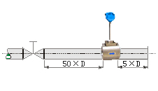流量調(diào)節(jié)閥或壓力調(diào)節(jié)閥盡量安裝在傳感器的下游5D以遠處,若必須安裝在傳感器的上游,傳感器上游應(yīng)有不小于50D的等徑直管段,下游應(yīng)有不小于5D的等徑直管段。