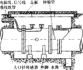 由于大口徑管道在多數(shù)場(chǎng)合下是埋在地下的,因此大口徑傳感器在安裝前應(yīng)做好水泥地坑。圖6-19所示是在給排水系統(tǒng)中常見的安裝形式。水泥地坑應(yīng)有足夠的活動(dòng)空間,側(cè)壁埋有敷設(shè)電纜的鋼管,上有蓋板防止雨淋,下有泄水管以免坑內(nèi)積水而使傳感器侵水。為了拆裝方便,傳感器應(yīng)放在墊腳上,且在下游側(cè)裝有活絡(luò)的伸縮管。圖6-20是測(cè)量鹽水流量計(jì)在地下水泥管污水排放系統(tǒng)中的安裝實(shí)例。