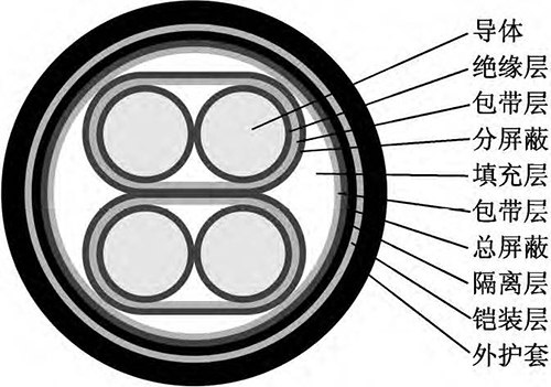 該新型電纜的結(jié)構(gòu)如圖1所示。導(dǎo)體為單股退火鍍錫軟銅線,以提高導(dǎo)體的導(dǎo)電性和防腐蝕性。在導(dǎo)體外繞包一層薄F4(聚四氟乙烯)半導(dǎo)電帶,有利于降低導(dǎo)體和絕緣之間的摩擦起電噪音。絕緣采用材料較為純凈、介電常數(shù)較小、具有一定彈性的聚丙烯絕緣級材料,并采用擠壓式擠出,減小絕緣層與導(dǎo)體的間隙。采用對絞組作為信號傳輸線,由于在兩根傳輸線上感應(yīng)的電壓接近相等,減小了電壓差值,提高了信號傳輸穩(wěn)定性;對絞組由兩種不同顏色絕緣線芯組成,相鄰線對對絞節(jié)距應(yīng)不大于100mm。對絞分屏蔽組(即對對絞組進行分屏蔽,每對對絞組外繞包兩層聚酯帶和一層厚0.04mm鋁塑復(fù)合帶繞包,內(nèi)置一根7×0.26mm鍍錫銅絞線作引流線)有利于對不同對絞組之間信號串音的抑制和隔離。對絞分屏蔽組同心式絞合成纜,在對絞分屏蔽組間填充非吸濕性材料,以保證纜芯圓整。在成纜纜芯外繞包兩層聚酯帶,再采用鋁塑復(fù)合帶繞包,內(nèi)置鍍錫銅線作引流線,以提高電纜電磁屏蔽能力。總屏蔽層外擠包隔離層(隔離護套),隔離層采用絕緣級低密度聚乙烯材料。隔離層外采用鎧裝層,鎧裝材料為高導(dǎo)磁合金鋼帶,其為強磁材料,可將外來的磁通大部分限制在鎧裝層的外表面上(僅有少部分能進入被屏蔽的空間);鎧裝時對高導(dǎo)磁合金鋼帶采用縱包焊接,確保其形成一連續(xù)圓柱管;鎧裝層可提高電纜抗電磁干擾水平以及對電纜進行加強,減少電纜振動引起的電動勢。外護套采用藍色軟PVC(聚氯乙烯)護層級電纜材料擠包,實現(xiàn)電纜防護。