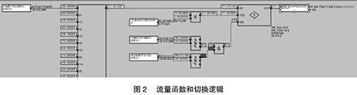 但是由于近期趨勢可能收集不到部分負荷段的相關數(shù)據(jù),在超出現(xiàn)有數(shù)據(jù)負荷的部分應采取必要的補救措施,可以參考相同負荷運行的另一臺余熱鍋爐的主蒸汽流量,以此來彌補現(xiàn)有數(shù)據(jù)的不足。為了保證數(shù)據(jù)切換的可靠性,切換條件要嚴謹,現(xiàn)有函數(shù)的負荷下線上增加25MW與另外一臺的燃機負荷大于100MW。如此設置的好處是當另一臺運行機組突然故障或跳機時保證數(shù)據(jù)能及時切換到函數(shù)輸出,保證機組的安全運行。具體操作見圖2。