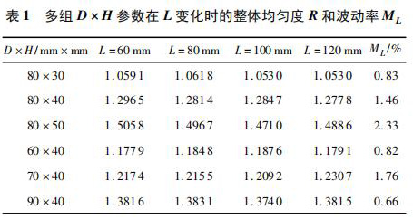 計算多組相同 D × H、不同 L 時 xy 平面的權函數(shù)整體均勻度 R 及波動率 ML,如表 1 所示。