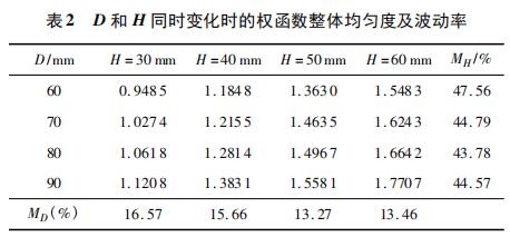 根據(jù)表 1 和表 2 權函數(shù)均勻度的波動率數(shù)值可以看出,MH > MD > ML,所以,矩形段 L,D,H 對于權函數(shù)均勻度的影響程度是依次增強的,高度 H 對權函數(shù)均勻度影響*大,寬度 D 影響稍小,長度 L 影響很小。且 D 和 H 越小,權函數(shù)整體均勻度 R 越小,權函數(shù)分布越均勻。
