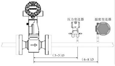 智能渦街流量計(jì)的口徑如果與工藝管道相同,不能滿足流量?jī)x表要求時(shí),或者在此流速下測(cè)量準(zhǔn)確度不能保證時(shí),需要縮小儀表口徑,從而提高管內(nèi)流速,保證測(cè)量精度。上下游必須有足夠的直管段,若傳感器安裝點(diǎn)的上游在同一平面上有 2 個(gè) 90°彎頭時(shí),上游直管段≥25D,下游直管段≥5D。根據(jù)測(cè)量的需要,需在智能渦街流量計(jì)附近測(cè)量壓力和溫度時(shí),測(cè)壓點(diǎn)應(yīng)在傳感器下游的(3 ~5)D 處,測(cè)溫點(diǎn)應(yīng)在傳感器下游的(6 ~8)D 處,如圖 3 所示。