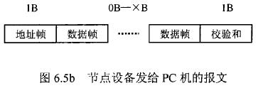 在飲用水流量計等節(jié)點設(shè)備和C機通信的過程中,由地址幀、命令幀、數(shù)據(jù)幀、校驗和可組成各種功能不同的報文。由于采用主從工作方式來實現(xiàn)通信,飲用水流量計等節(jié)點設(shè)備僅能接收并執(zhí)行PC機發(fā)送來的控制命令,而不能發(fā)送命令給PC機。因此,由PC機發(fā)往流量計等節(jié)點設(shè)備的報文一般包括一個地址幀,一個命令幀,若干個數(shù)據(jù)幀和一個校驗和,其報文格式圖.6a5所示;而由流量計等節(jié)點設(shè)備發(fā)往PC機的報文一般包括一個地址幀,若干個數(shù)據(jù)幀和一個校驗和,其報文格式如圖6.5b所示。
