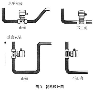現(xiàn)場安裝時應注意遠離可能對其產(chǎn)生干擾的大型設備,防止長期的熱輻射和其他如磁場直射等環(huán)境影響。為確保高測量精度和較好的零點穩(wěn)定性,進行校正前,高壓電磁流量計應裝入工藝介質中至少 24 小時電極鈍化。安裝的管路設計應確保管道始終充滿流體,防止測量誤差,管路設計圖見圖 3。