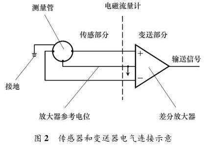 防腐型電磁流量計(jì)主要由兩部分組成:流量傳感器和信號(hào)變送器,如圖 2 所示。傳感器上的勵(lì)磁線圈接受變送器傳輸來(lái)的勵(lì)磁電流產(chǎn)生磁場(chǎng),輸出感應(yīng)電動(dòng)勢(shì)信號(hào);信號(hào)變送器則將感應(yīng)電動(dòng)勢(shì)信號(hào)轉(zhuǎn)換為流量信號(hào)或模擬量信號(hào)送至控制系統(tǒng)。防腐型電磁流量計(jì)按組成方式分為一體式和分體式。防腐型電磁流量計(jì)穩(wěn)定工作另外一個(gè)重要條件是接地。當(dāng)流體流動(dòng)穿過(guò)磁場(chǎng)時(shí),以導(dǎo)電流體本身作為參考電位,在測(cè)量管一側(cè)電極產(chǎn)生正電勢(shì),另一側(cè)產(chǎn)生負(fù)電勢(shì),形成電勢(shì)差。但此電動(dòng)勢(shì)信號(hào)一般只有幾毫伏,易受外界干擾。為防止干擾,將參考電位接入大地作為零電位,保證傳感器輸出精確穩(wěn)定的信號(hào)。傳感器和轉(zhuǎn)換器的接地端必須與被測(cè)介質(zhì)同電位,才能構(gòu)成對(duì)稱的輸入輸出回路。