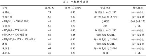防腐型電磁流量計(jì)要根據(jù)被測(cè)流體的溫度、壓力、速度以及含固顆粒的硬度、含量和粒徑大小來(lái)決定測(cè)量管內(nèi)襯的材質(zhì)。該濕法磷酸裝置中,防腐型電磁流量計(jì)測(cè)量管襯里材質(zhì)的種類(lèi)見(jiàn)表 2。