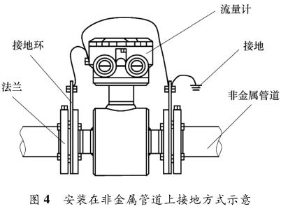防腐型電磁流量計(jì)安裝在金屬管道上,安裝時(shí)將金屬管道與防腐型電磁流量計(jì)相連接,接地線再接入接地網(wǎng),如圖 3 所示。