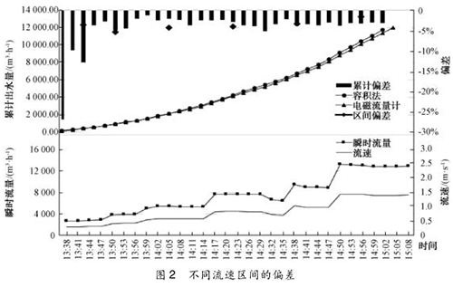 圖 2 的結(jié)果顯示,容積法校驗電磁流量計累計偏差開始階段不穩(wěn)定,后期趨于穩(wěn)定,在 -3. 0%附近。這是測量中不可避免存在某幾個時刻(特別出廠水流量改變時)某些測量點(diǎn)液位波動較大,導(dǎo)致記錄數(shù)值與真實(shí)情況存有較大差異,一開始累計出水總量較少,偏差會相對放大,在后期累計水量大,這一原因?qū)е碌钠顪p少,偏差值也趨于穩(wěn)定。