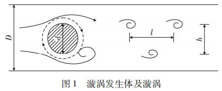 蒸汽流量計(jì)是由漩渦發(fā)生體、頻率檢測器和信號(hào)轉(zhuǎn)換器等環(huán)節(jié)組成,輸出 4 ~ 20 mADC 信號(hào)或脈沖電壓信號(hào)。其測量原理是在流動(dòng)的流體中的垂直流動(dòng)方向安放 1 根或多根非流體型阻流體,在一定的流量范圍內(nèi),流體在阻流體兩側(cè)交替地分離、釋放出 2 串頻率正比于管道內(nèi)的平均流速、規(guī)則的、不對稱有規(guī)律的交替漩渦列,如圖 1 所示,且兩側(cè)漩渦旋轉(zhuǎn)方向相反。采用檢測元件測出漩渦頻率就可以推算出流體的流量。