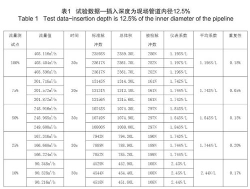 氣體渦輪流量計(jì)插入深度為現(xiàn)場管道內(nèi)徑的 12.5%時(shí),試驗(yàn)數(shù)據(jù)如下(以 DN200 為例):
