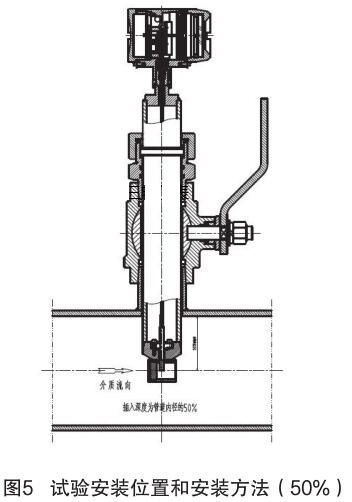 對氣體渦輪流量計(jì)和插入式電磁流量計(jì)的結(jié)構(gòu)原理進(jìn)行分析,插入式電磁流量計(jì)的信號采集點(diǎn)在標(biāo)校管道內(nèi)12.5% 為宜,因它屬電磁類流量計(jì),而煙氣流量計(jì)是根據(jù)“卡門渦街”原理進(jìn)行測量管道內(nèi)流量,根據(jù)標(biāo)校管道內(nèi)層流和湍流的分析,以及氣體渦輪流量計(jì)獨(dú)特的探頭結(jié)構(gòu)形式,確定氣體渦輪流量計(jì)的插入深度為標(biāo)校管道內(nèi) 50%,試驗(yàn)安裝位置和安裝方法如圖 5 所示。