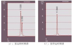 對振動采集器獲取的信號進(jìn)行譜分析,超聲波污水流量計組運轉(zhuǎn)狀態(tài)下主要振動頻率為11.33Hz和12.38Hz,其中12.38Hz為液體流量計轉(zhuǎn)動頻率;停運時,12.38Hz的液體流量計轉(zhuǎn)頻消失,11.33Hz的外部激擾力依然存在。