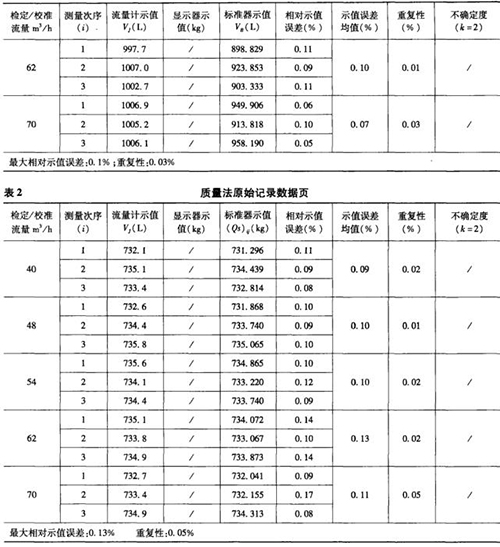 表1是用容積法現(xiàn)場檢測流量計后,電腦自動生成的原始記錄數(shù)據(jù)頁部分,表2是用質量法現(xiàn)場檢測流量計后,電腦自動生成的原始記錄數(shù)據(jù)頁部分。