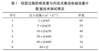 在實際應(yīng)用中,使用輕型注脂防噴裝置與內(nèi)流式集流智能型渦輪流量計配套技術(shù)對喇叭口在射孔層上注聚井進(jìn)行測試。輕型注脂防噴裝置與內(nèi)流式集流智能型渦輪流量計配套技術(shù)施工工藝參見文獻(xiàn),測試情況見表 1 所示,低注入量井( ≤10 m3 /d) 占到 56. 60% 。