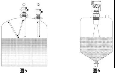 6、對于頂部為平面的錐形容器,四線制超聲波液位計應(yīng)盡量安裝在頂部中央,這樣可以保證測量到容器底部,如圖6所示。
