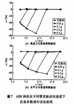 以應(yīng)力式模擬渦街流量計(jì)為被測(cè)對(duì)象,在5m/s、7.5m/s、11m/s、15.5m/s、20.5m/s流速下,分別進(jìn)行了無振動(dòng)和施加管道周期振動(dòng)的實(shí)流標(biāo)定試驗(yàn)。管道振動(dòng)方向?yàn)榇怪狈较蚝退椒较?,加速度?.05-0.5g。根據(jù)試驗(yàn)數(shù)據(jù),繪制出不同管道振動(dòng)加速度下渦街儀表系數(shù)相對(duì)于無管道振動(dòng)時(shí)平均儀表系數(shù)的相對(duì)誤差曲線,垂直方向結(jié)果如圖3(a)所示。