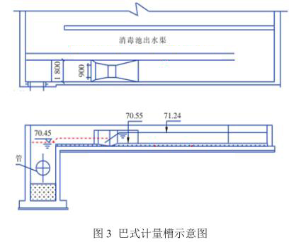 該廠改造后出水經二氧化氯消毒后直接排放,為節(jié)省占地,出水明渠與接觸消毒池合建,位于接觸池末端。消毒池出水經堰板跌水后通過2.3米的孔洞180°轉彎流入出水計量明渠。如圖3所示。采用巴式計量槽+超聲波液位計測定流量。